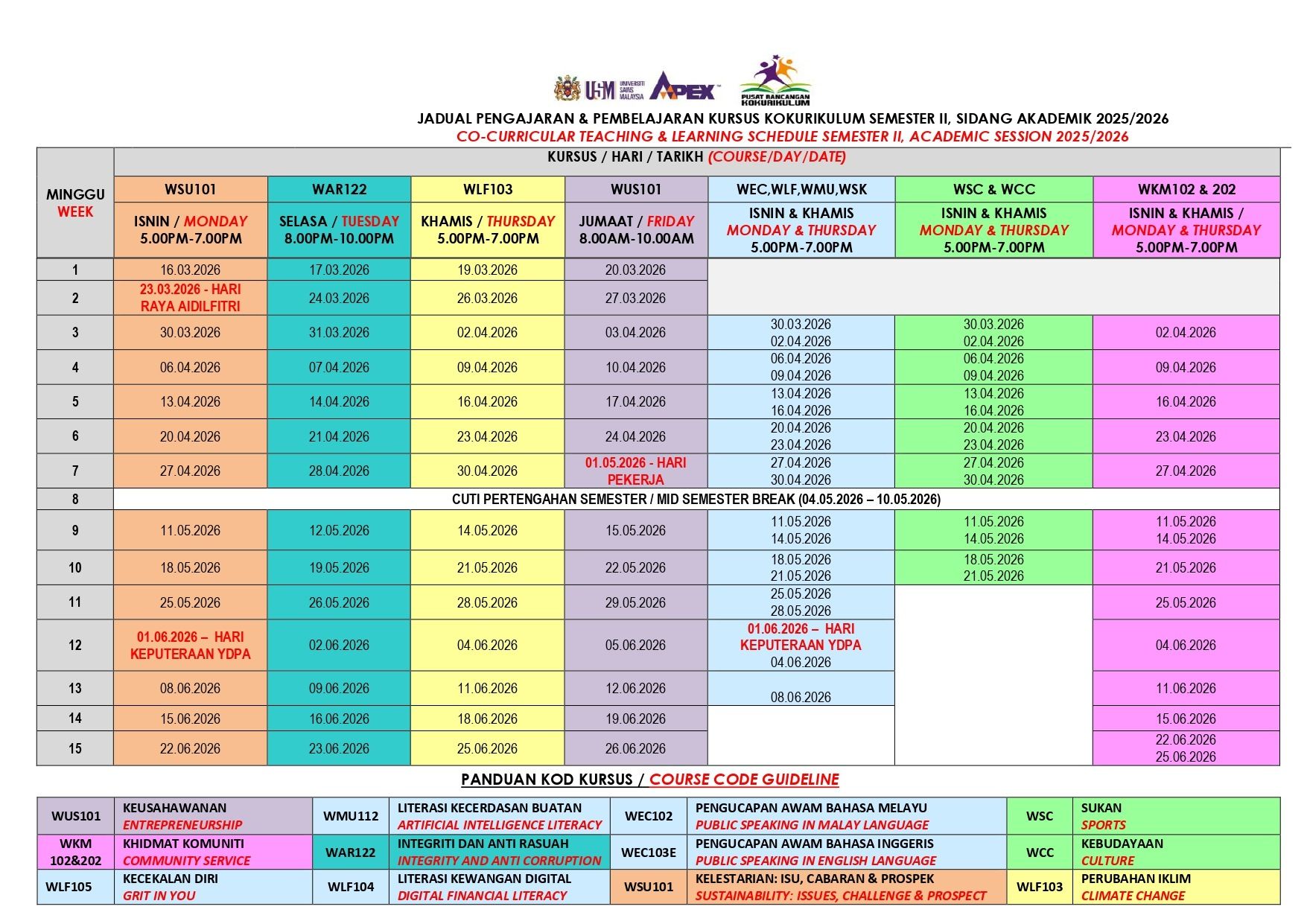 JADUAL PENGAJARAN DAN PEMBELAJARAN SEMESTER II SIDANG AKADEMIK 2025/2026