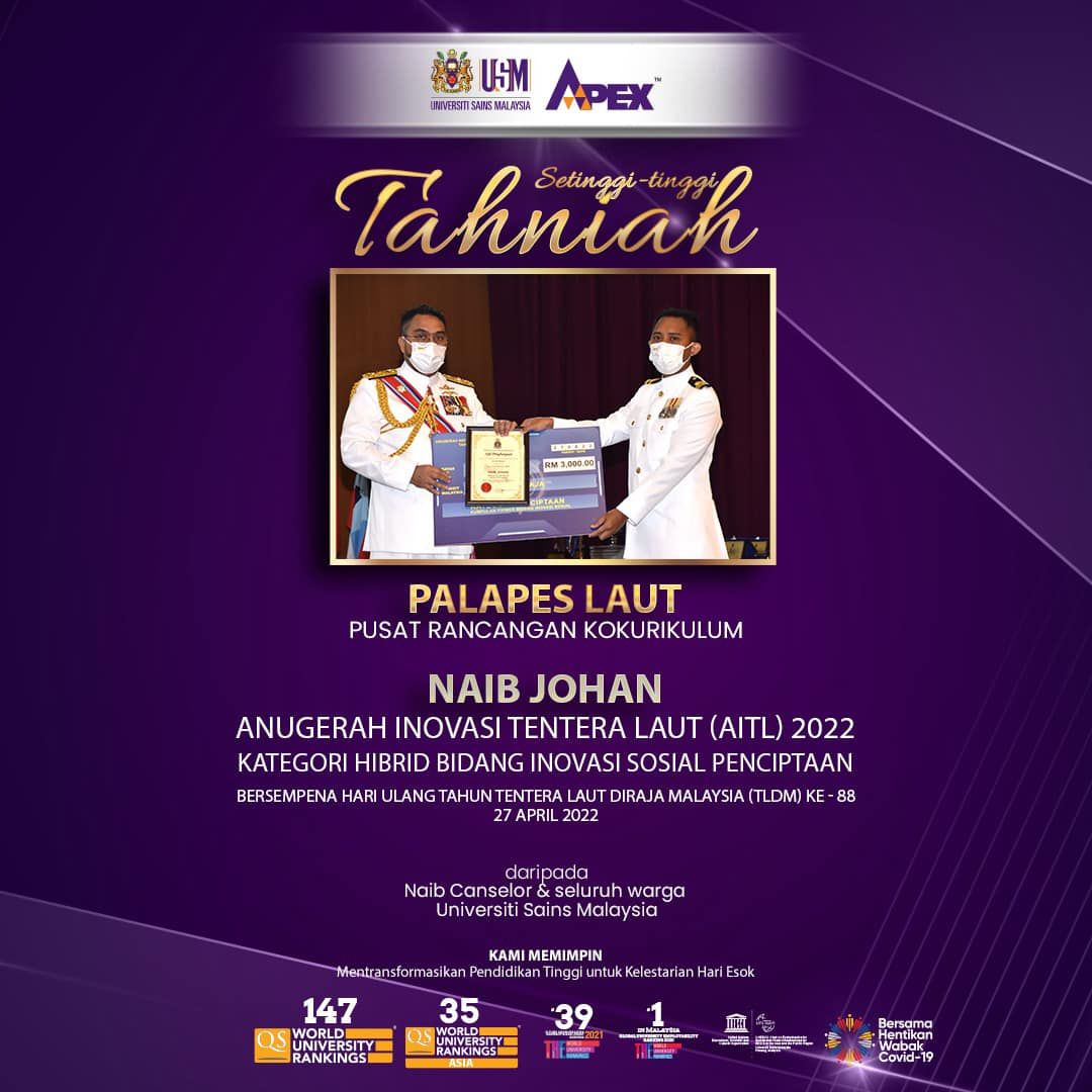 Pasukan Latihan Pasukan Simpanan (PALAPES) Laut USM melakar sejarah apabila berjaya mendapat Naib Johan dalam Anugerah Inovasi Tentera Laut (AITL) bagi kategori hibrid bidang inovasi sosial penciptaan bersempena Hari Ulang Tahun Tentera Laut Diraja Malaysia (TLDM) yang ke – 88.