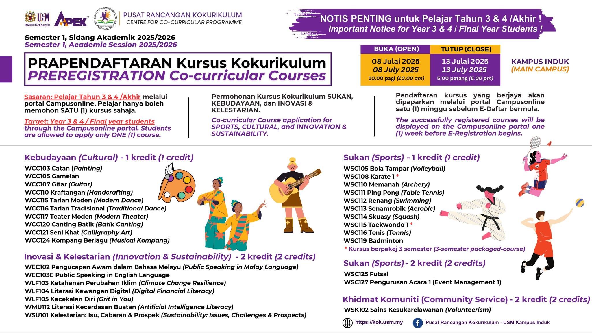 Pre-registration of Co-curricular Courses for the upcoming Semester 1, Academic Session 2025/2026 will be held as follows:-